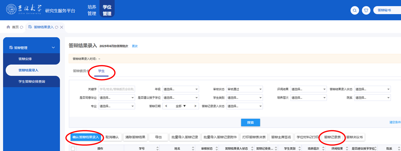 “吉林大学研究生服务平台https://yjs.jlu.edu.cn”内“学位管理”部分(以下简称“系统”)05月27日至06月16日开通。成绩审核最终未通过者无法参与本次答辩(博士预答辩结果务必在06月10日16:00前系统中录入并确认,未确认将影响成绩审核无法申请答辩。